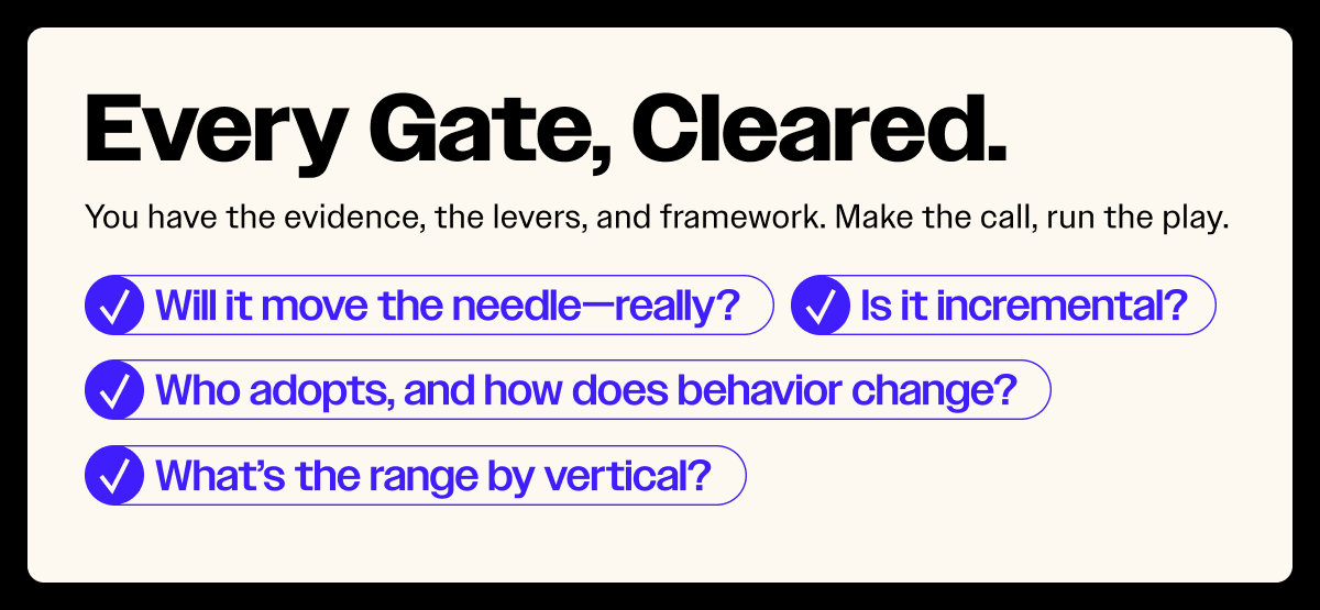 - Conservative floor. Assume outcomes near the low end of your vertical (+9–12%). This is what you can plan against responsibly, even with modest adoption.