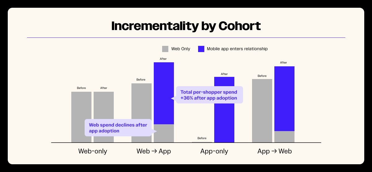 - Top-of-funnel expansion you’d otherwise miss. If app-first customers wouldn’t transact on mobile web, then the app isn’t just shifting where they buy; it’s creating first purchases. At scale, that is the difference between net-new customers in your file and net-new customers in a competitor’s.