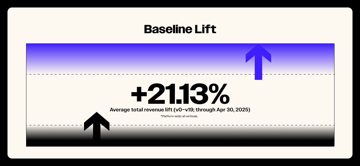3. The floor is meaningful; the range is credible. Across versions 0–19, the platform-wide average lift is +21.13%, with most categories clustering in the +16–24% band. Floors near +10–12% still clear materiality at scale; for a $50M brand, that’s roughly $5M in incremental revenue. The distribution is why finance can underwrite this: use your category average as the baseline, recognize that disciplined execution moves you up the band, and treat outcomes below the average as execution risk—not proof the channel is speculative.