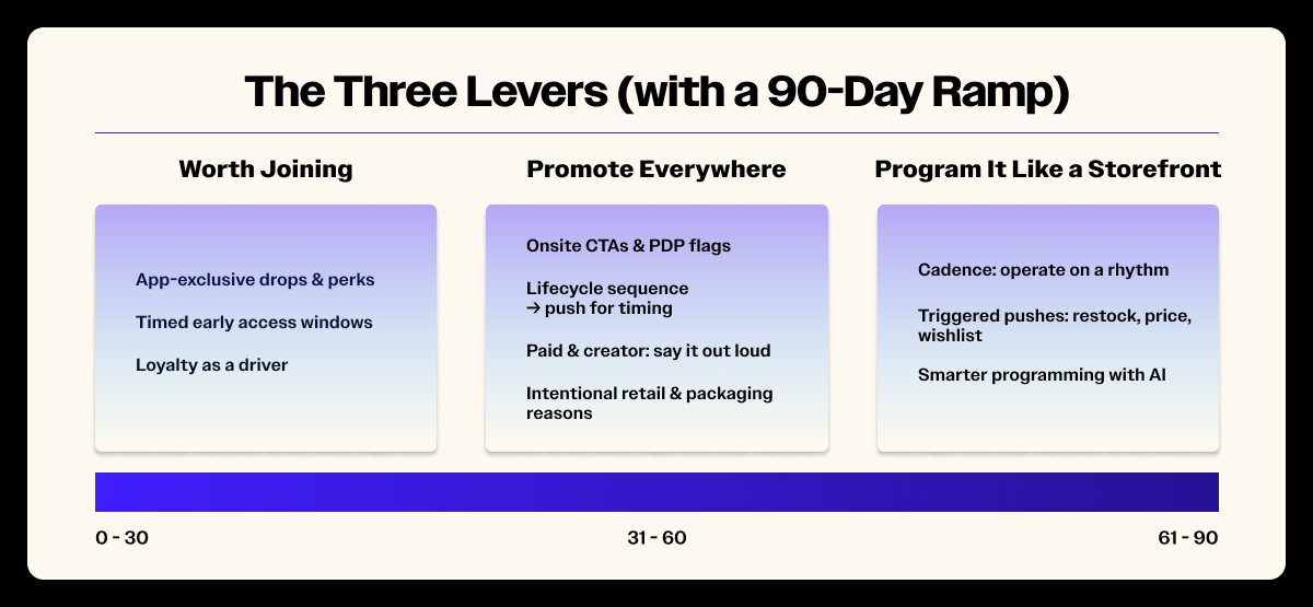 - First 30 days: Establish core reasons to join (exclusives, early access, loyalty unlocks) and stand up your foundational push cadences.