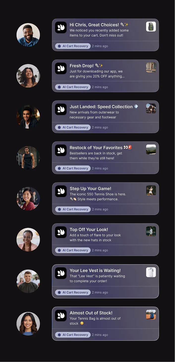 AI Push Notifications automatically create and send thousands of personalized, high-performing notifications for you that your customers actually want to open. With AI-powered triggers based on behavior, you can recover revenue with timely, on-brand messages targeted to each shopper without lifting a finger.