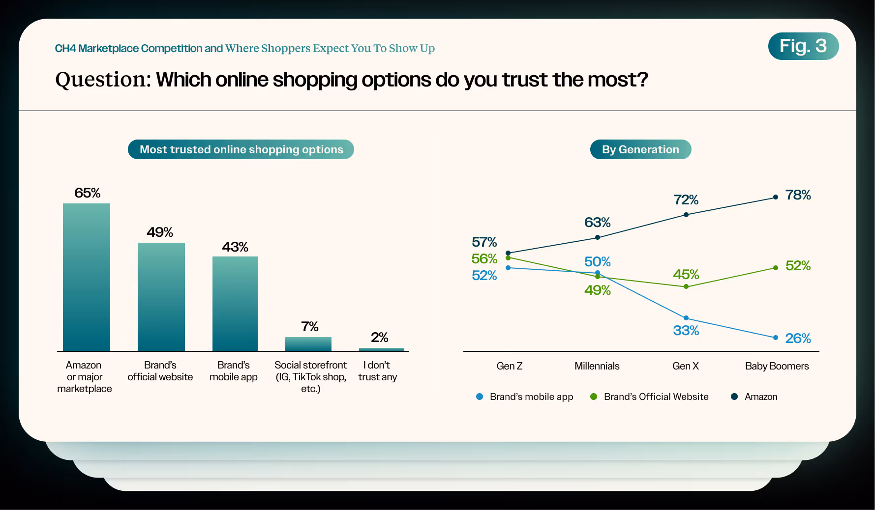 - And skepticism is rising. A similar share of respondents say they wouldn’t buy directly from any channel — a major trust signal that affects ad-to-checkout strategy.