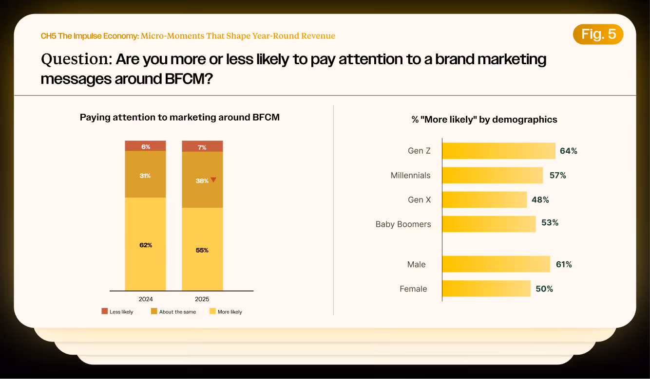 - Only ~1 in 4 shoppers are comfortable buying immediately from a social ad (24%), app push (23%), or email (22%)—meaning trust still decides most conversions.